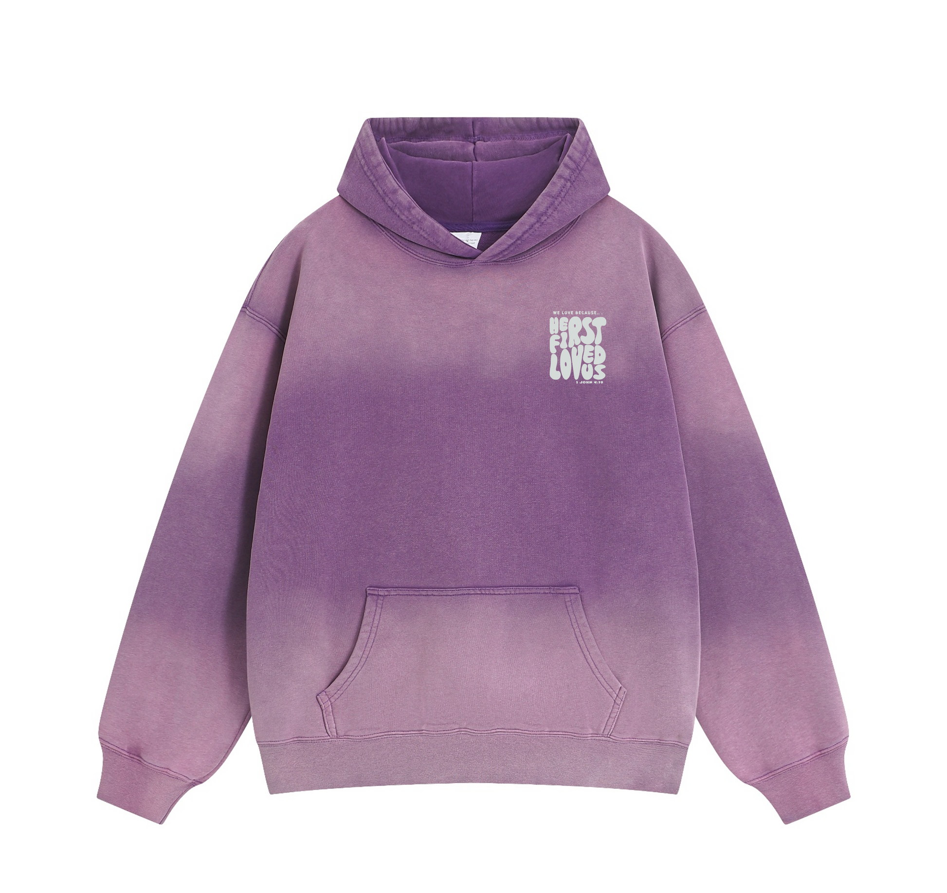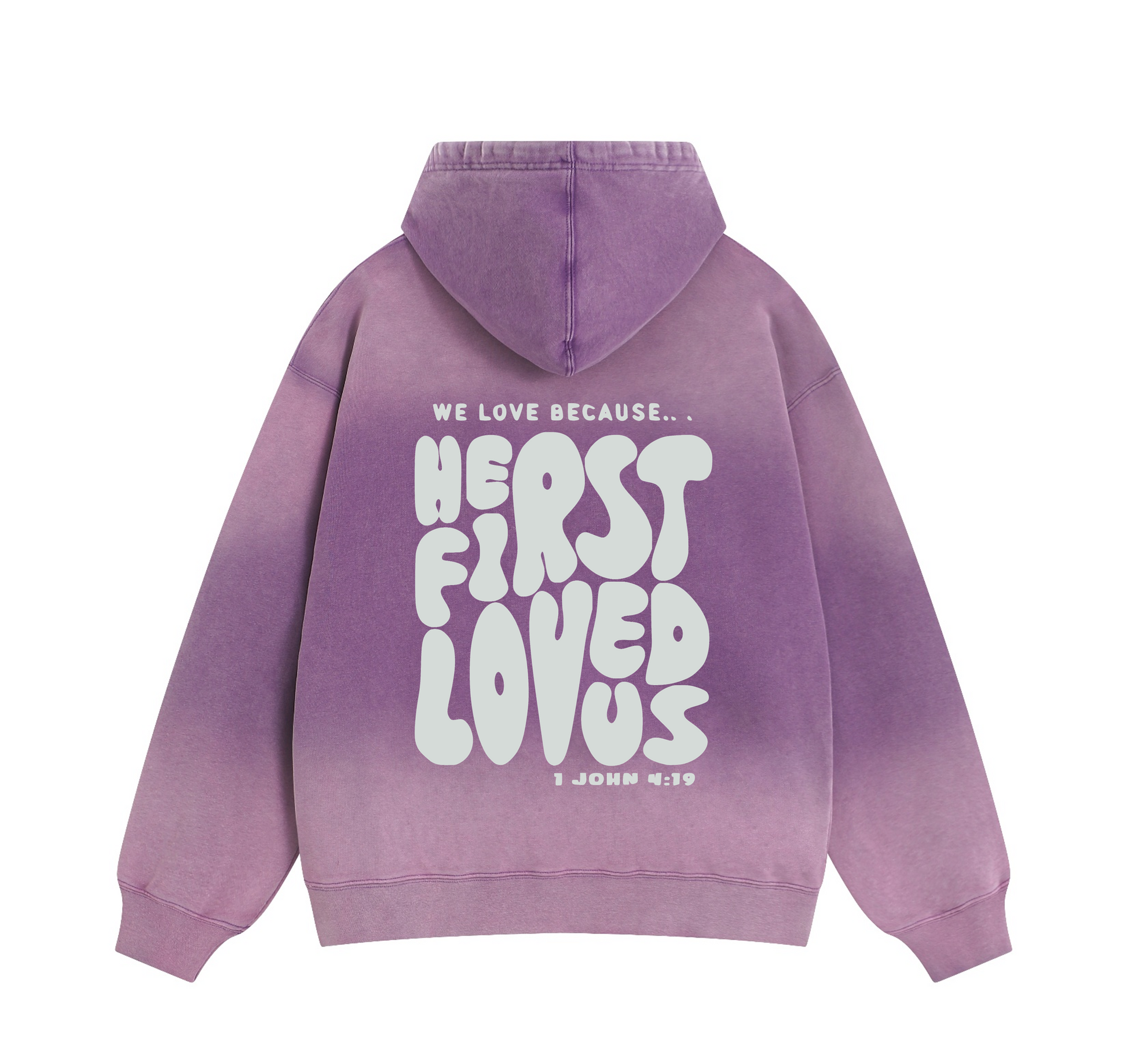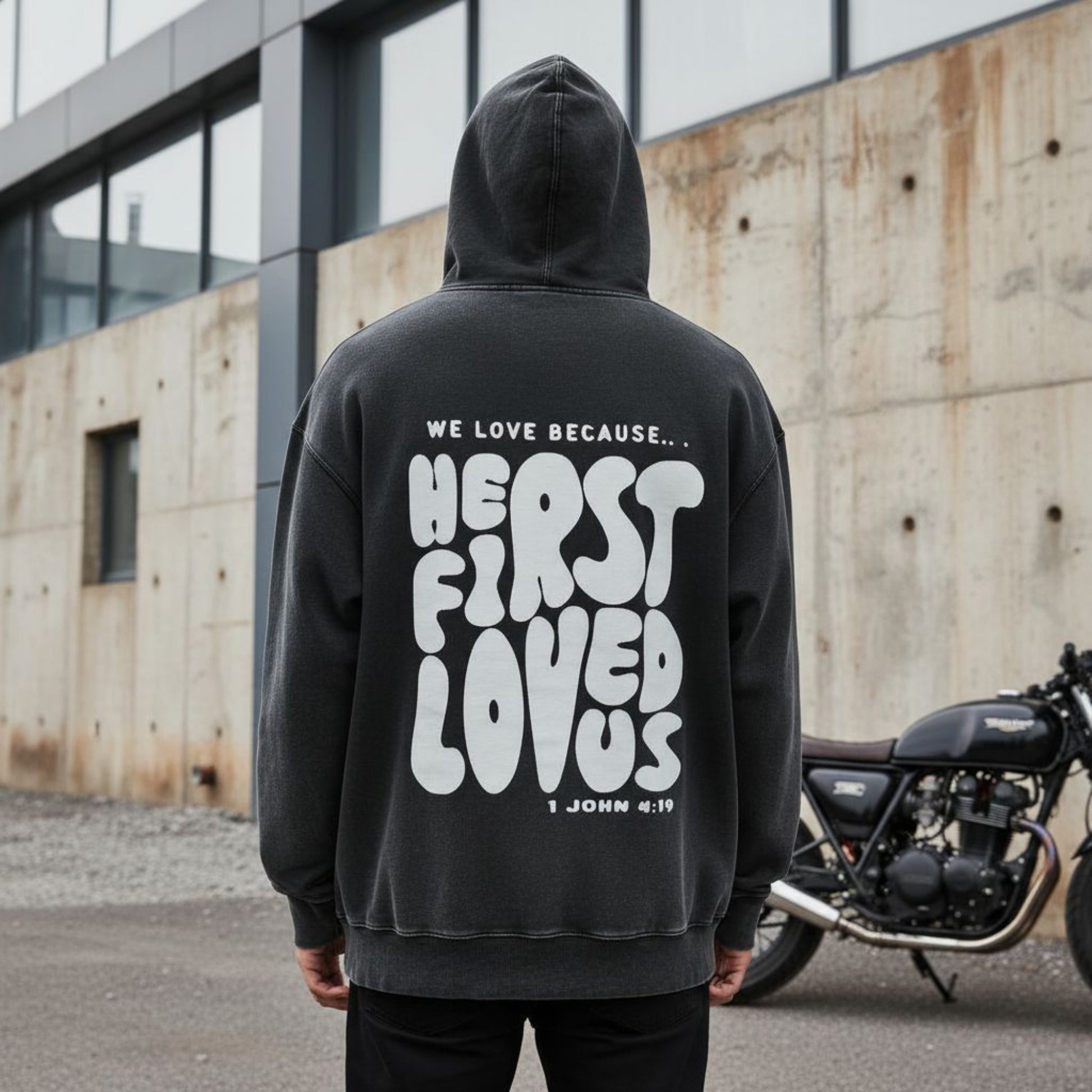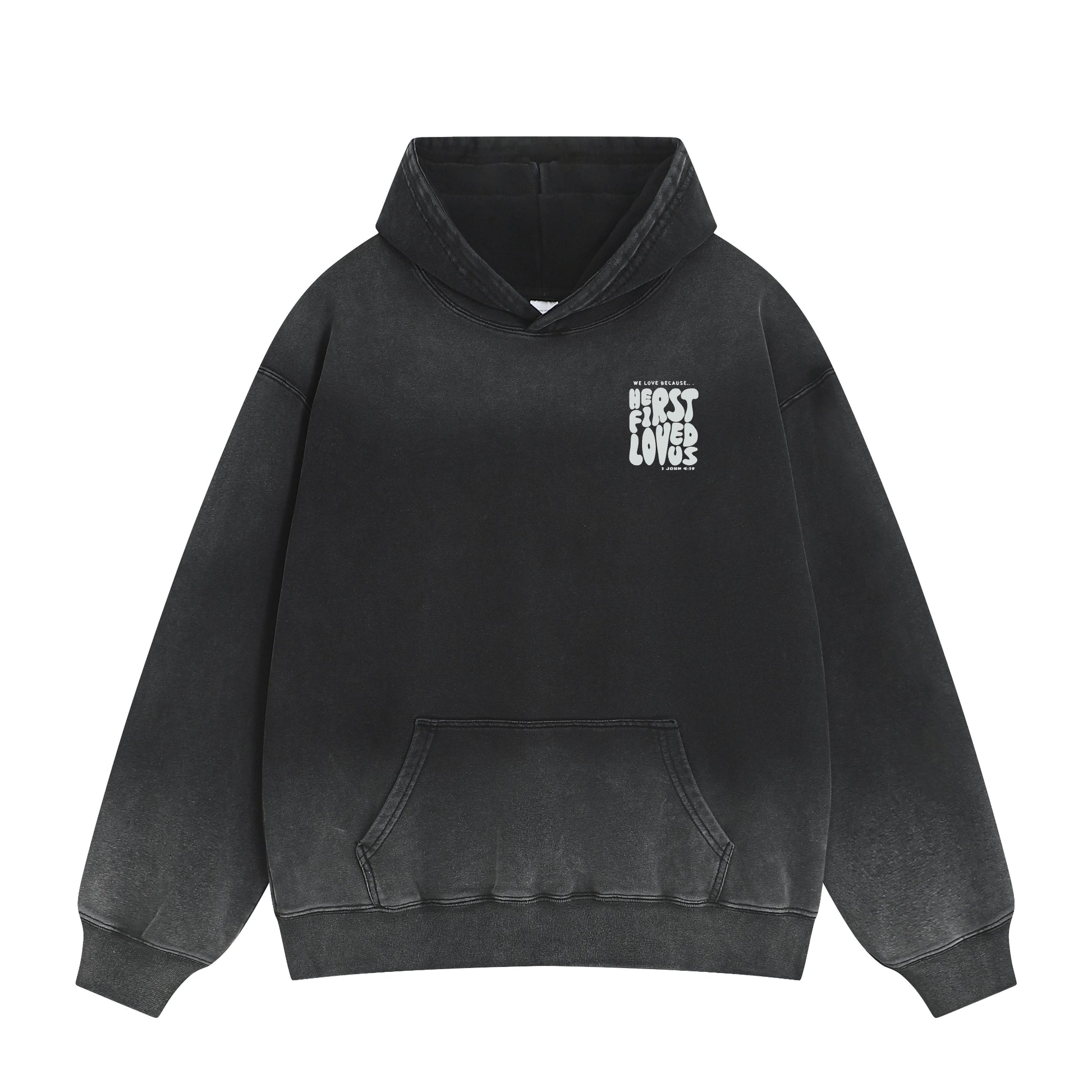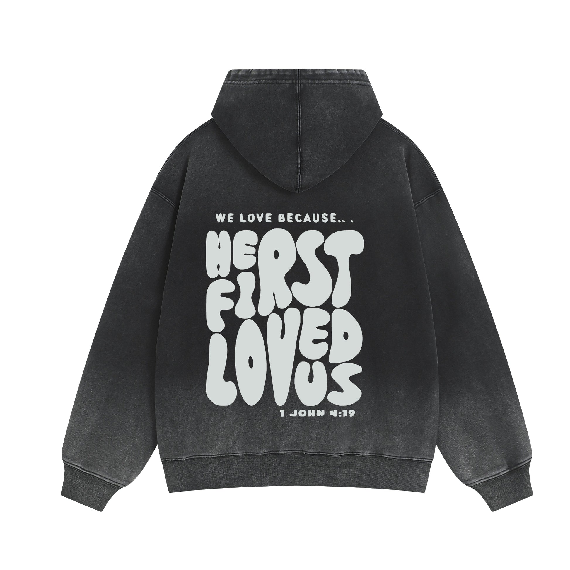 Embrace faith and vintage style with our Washed Black "He First Loved Us" Hoodie. This cozy pullover features a unique faded black finish and the inspiring 1 John 4:19 scripture, "We love because He first loved us," displayed boldly on the back. Crafted for a relaxed, comfortable fit, it's an essential piece for expressing your faith with understated style.