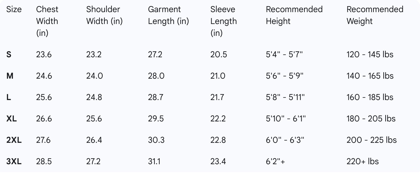 Recommendations: Suggested height and weight are general guidelines. For the best fit, we highly recommend prioritizing the Chest Width measurement.